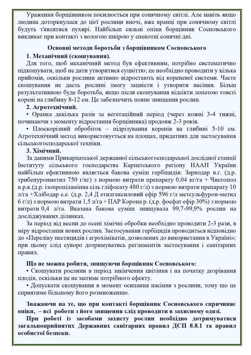 НЕБЕЗПЕЧНІСТЬ БОРЩІВНИКА СОСНОВСЬКОГО ТА РЕКОМЕНДАЦІЇ ЩОДО ЗАПОБІГАННЯ ЙОГО ПОШИРЕННЮ