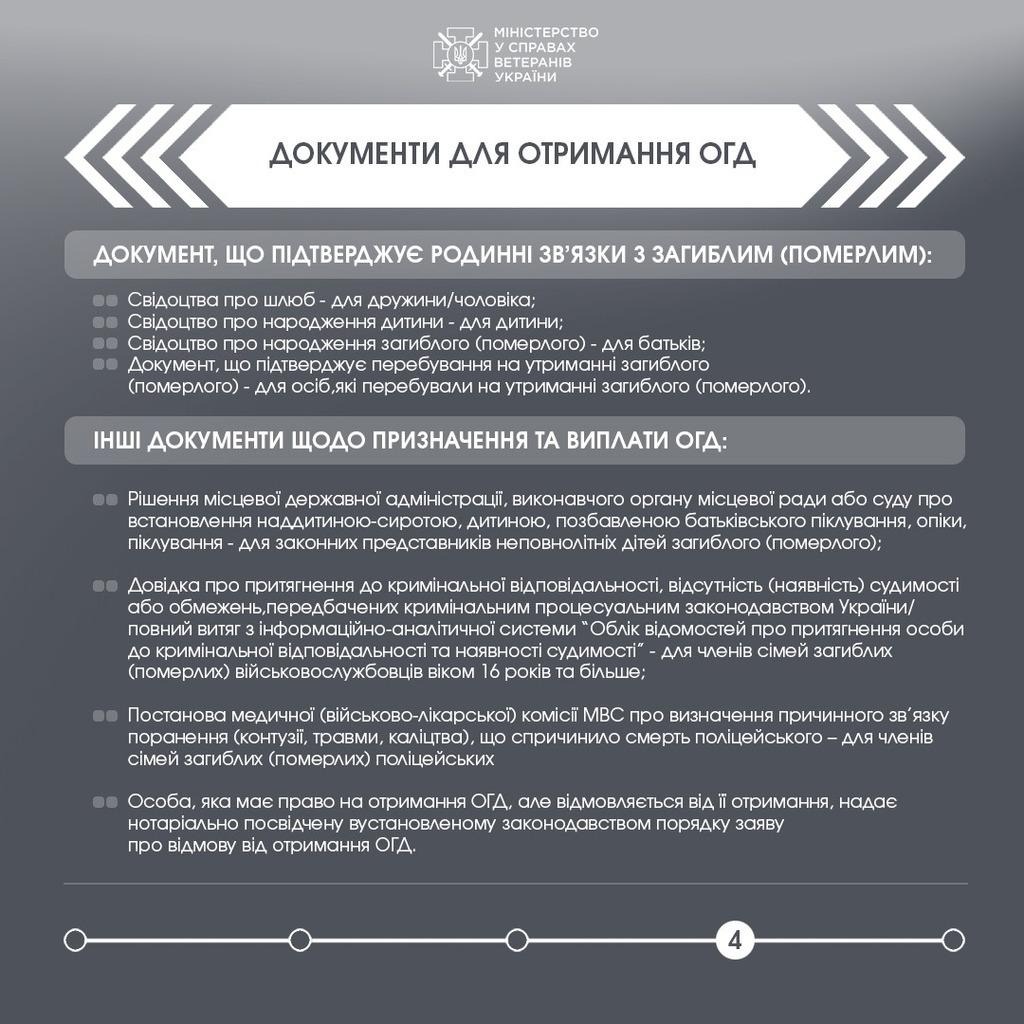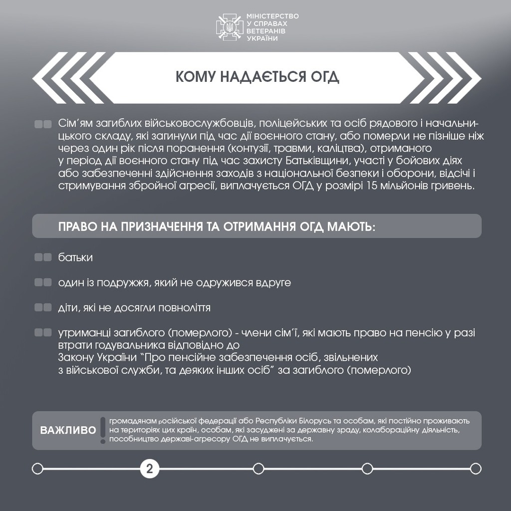 За чинним законодавством сім’ям загиблих військовослужбовців, поліцейських та осіб рядового і начальницького складу, які загинули під час дії воєнного стану, або померли внаслідок поранення, отриманого у період дії воєнного стану під час захисту держави, виплачується одноразова грошова допомога (ОГД) у розмірі 15 мільйонів гривень.