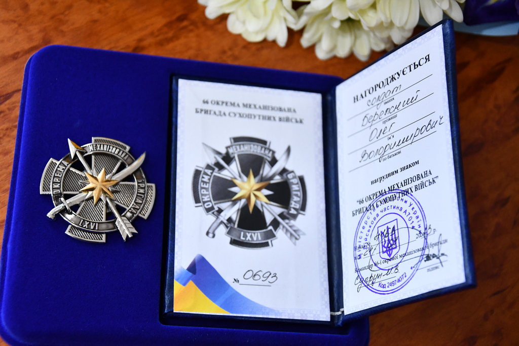 Сьогодні, 27 лютого, під час чергового засідання виконавчого комітету відбулася церемонія передачі нагрудного знака «66 окремої механізованої бригади сухопутних військ». Цією відзнакою Олега Бережного посмертно нагороджено «за проявлені мужність та героїзм, стійкість та рішучість дій під час забезпечення національної безпеки і оборони, відсічі і стримування збройної агресії російської федерації …». Досягнення сина-Героя отримала мати.