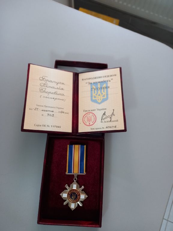 Богдан Романчук. Віталій Братусь. Їхня мужність, відданість, боротьба – неоціненні. Але сьогодні в руках матерів – лише холодний метал державної відзнаки. Орден «За мужність» III ступеня. Посмертно.