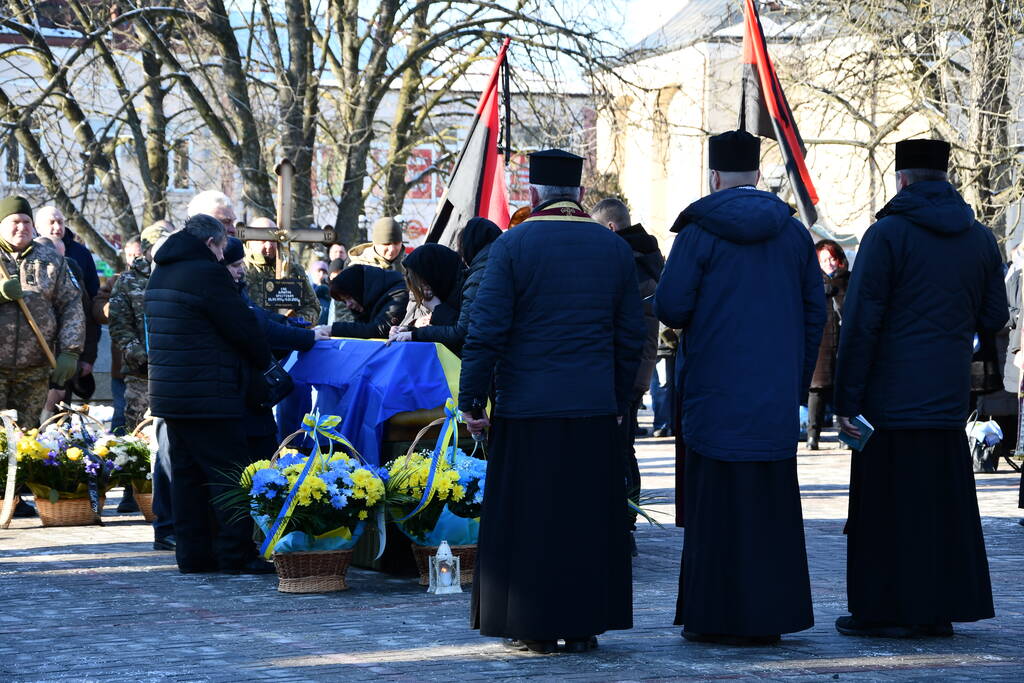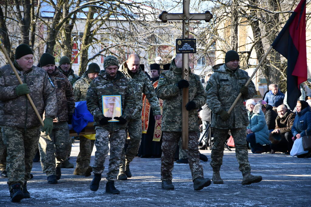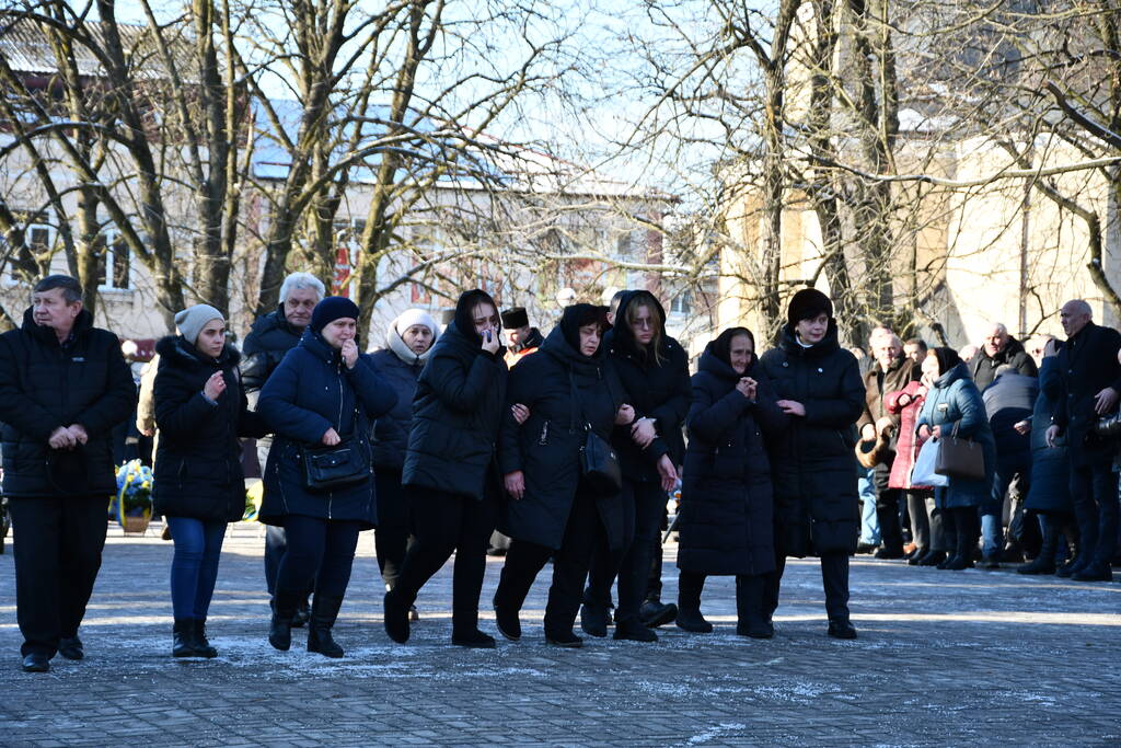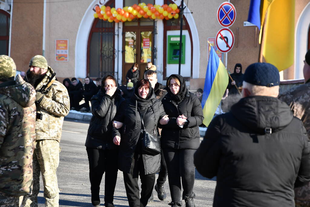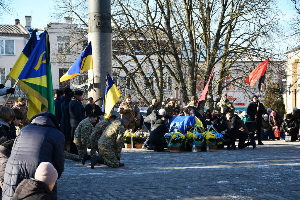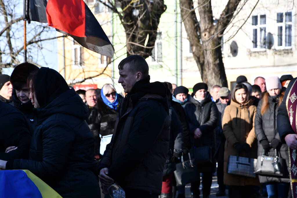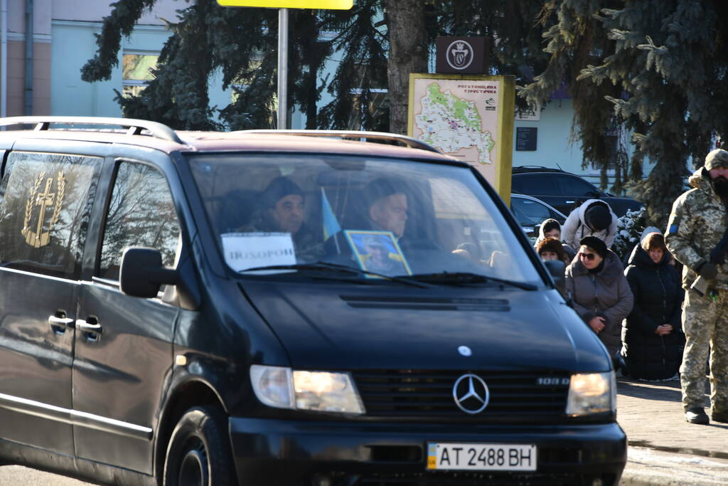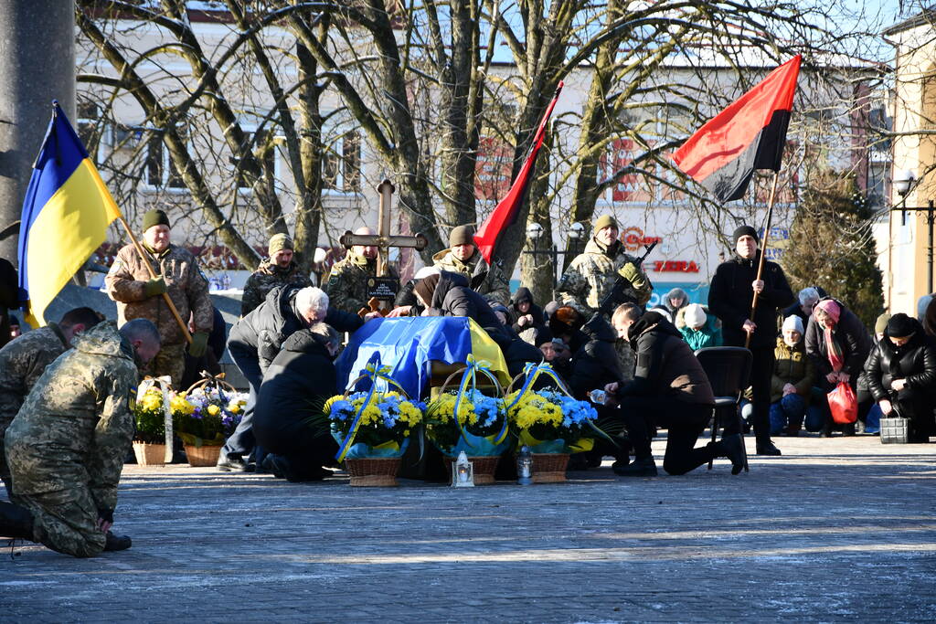 Тишу розривають важкі звуки сирен, що супроводжують кортеж із тілом воїна. Уздовж дороги колони людей стоять на колінах. За домовиною іде горем вбита старенька мама, яка прощається вже з другим своїм сином-захисником на цій площі. Поруч неї - дружина, доньки та родина. Сльози змішуються зі снігом, а серця наповнюються болем – Рогатинська громада зустрічає свого захисника Дмитра Саса з Лучинців.