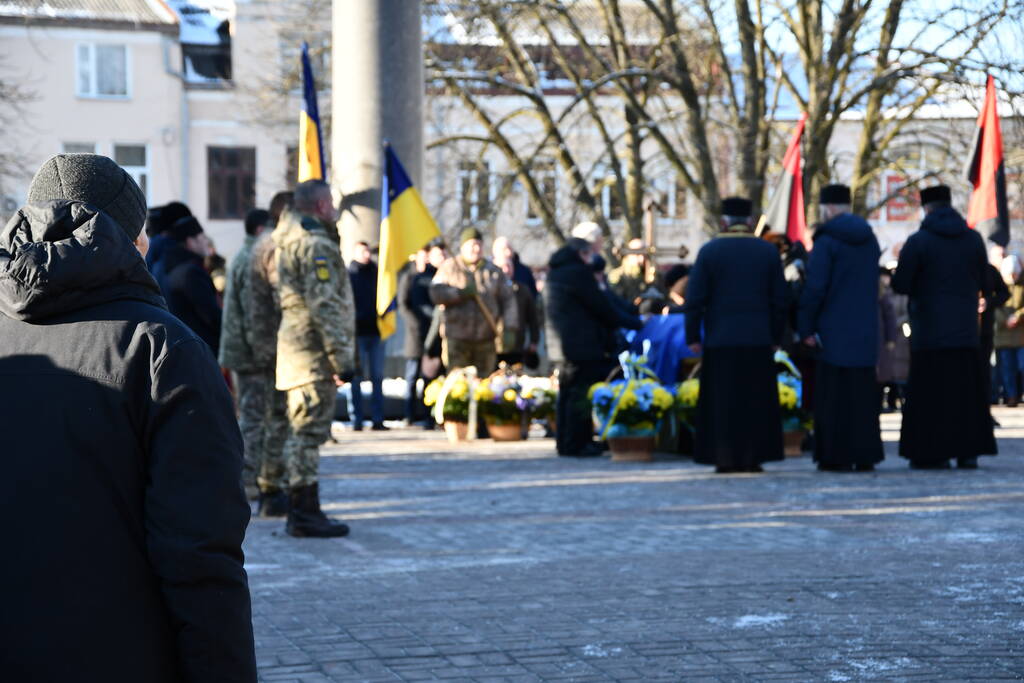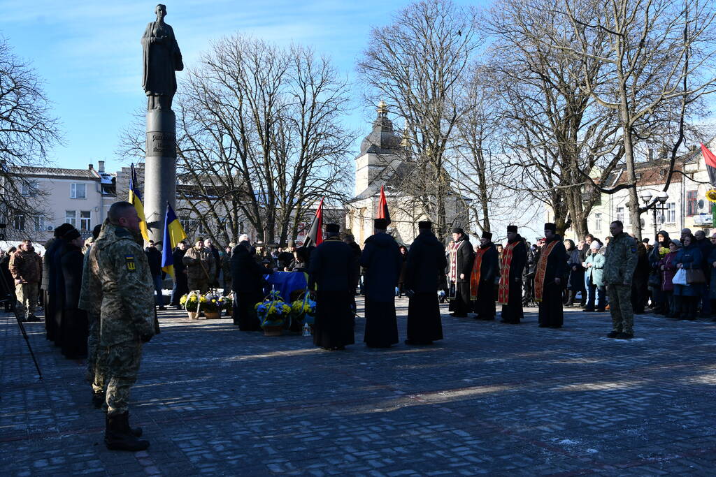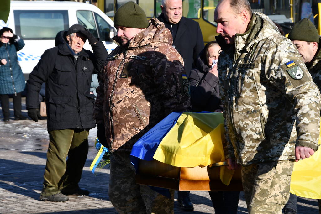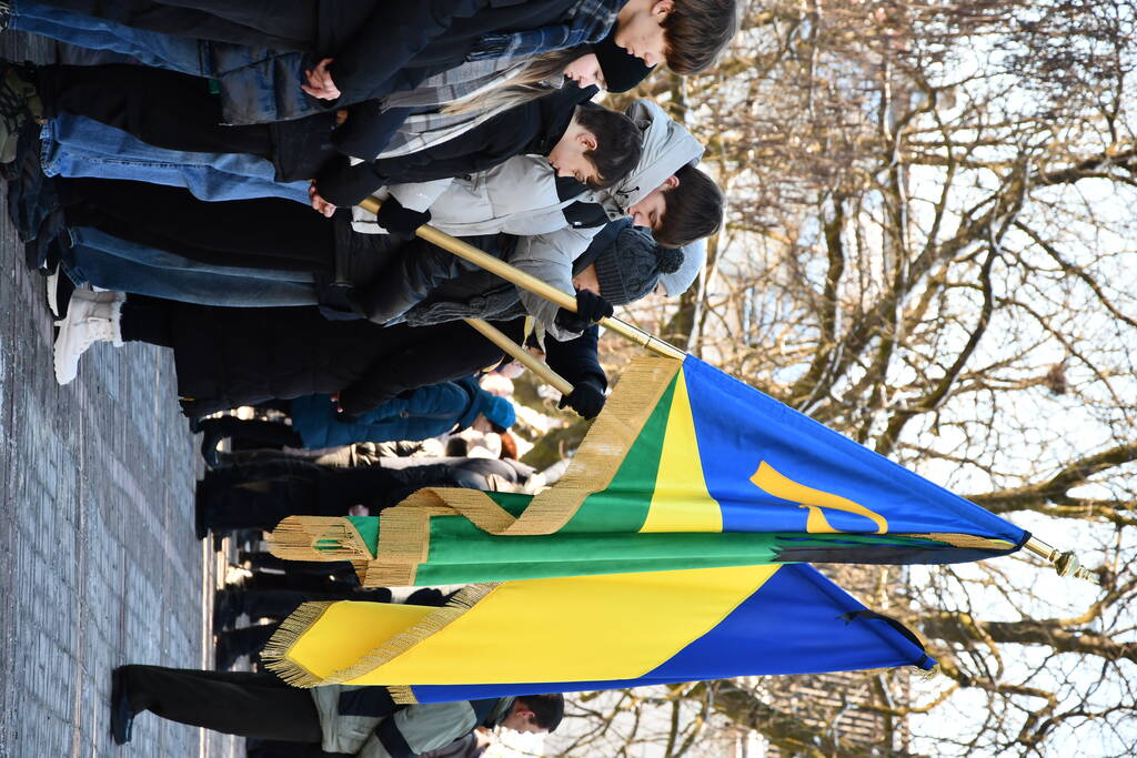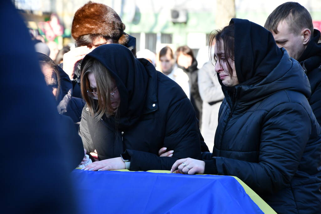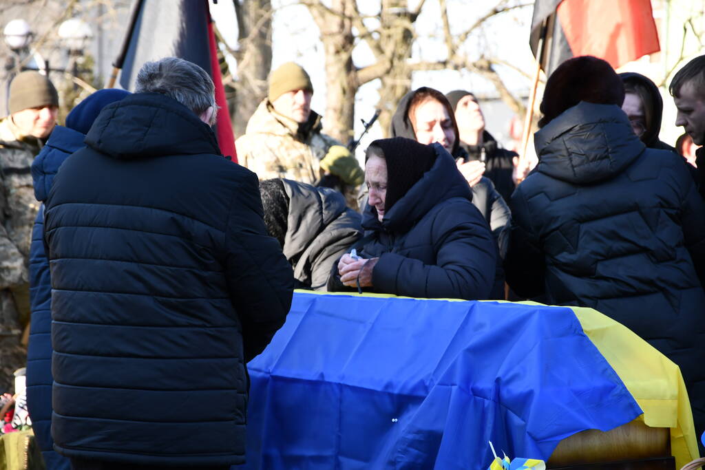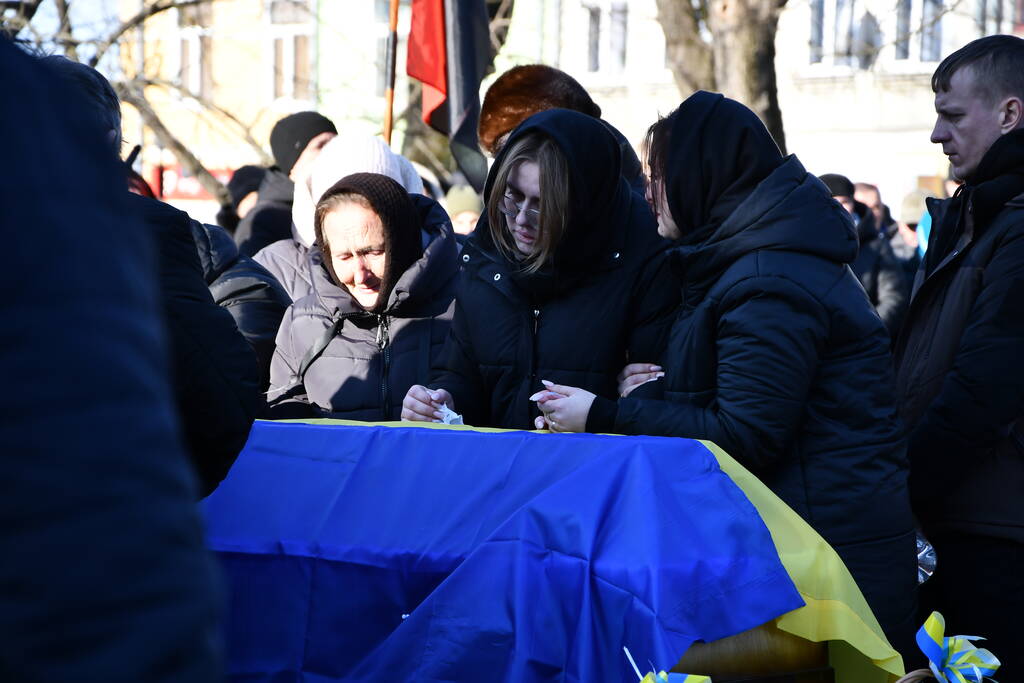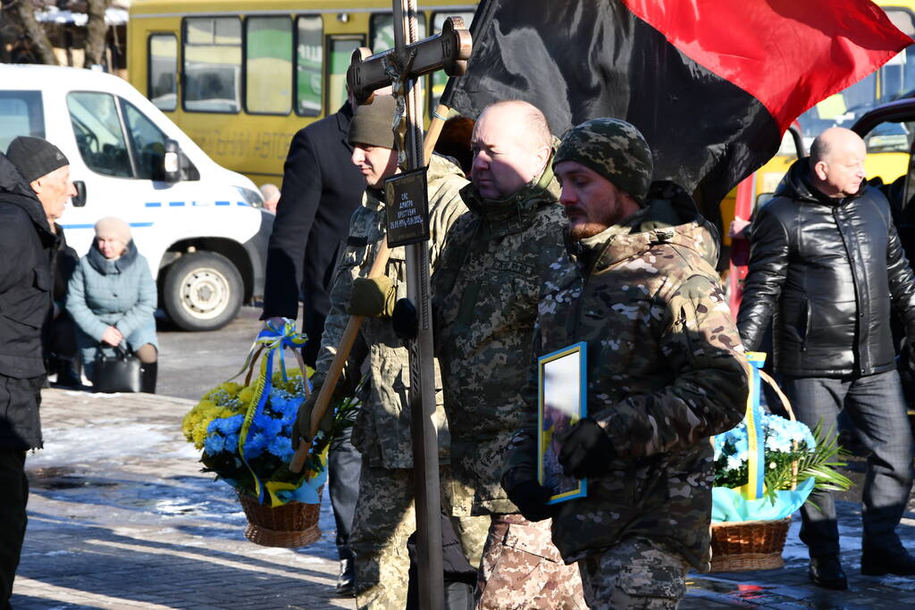 Тишу розривають важкі звуки сирен, що супроводжують кортеж із тілом воїна. Уздовж дороги колони людей стоять на колінах. За домовиною іде горем вбита старенька мама, яка прощається вже з другим своїм сином-захисником на цій площі. Поруч неї - дружина, доньки та родина. Сльози змішуються зі снігом, а серця наповнюються болем – Рогатинська громада зустрічає свого захисника Дмитра Саса з Лучинців.