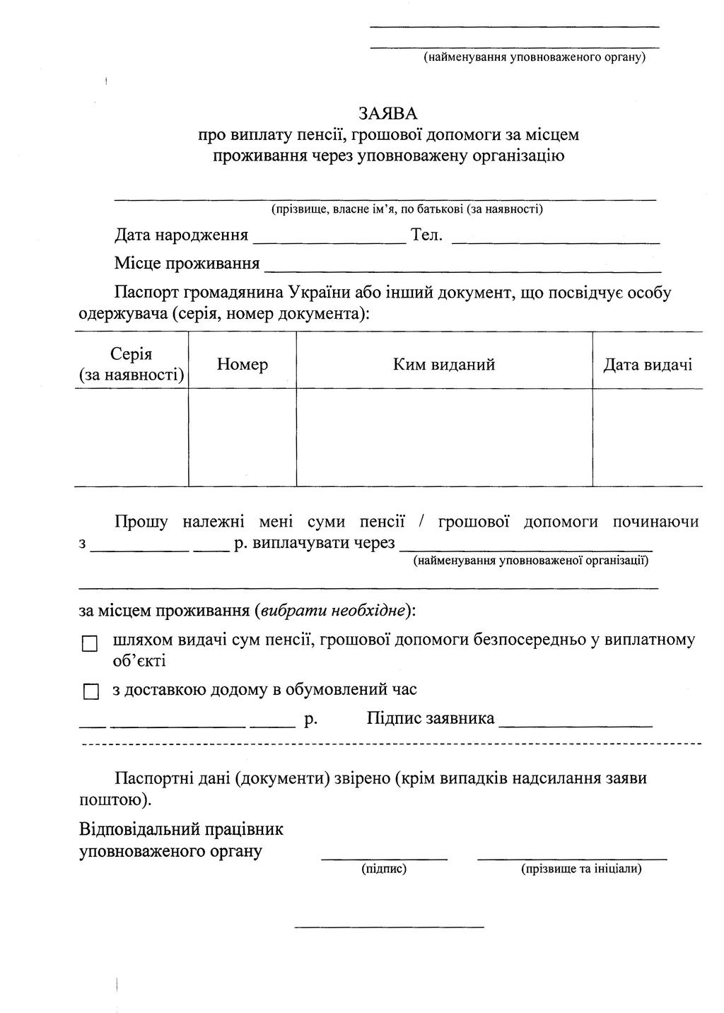Додаток 1. Шаблон заяви про виплату пенсії грошової допомоги за місце проживання через уповноважену організацію.