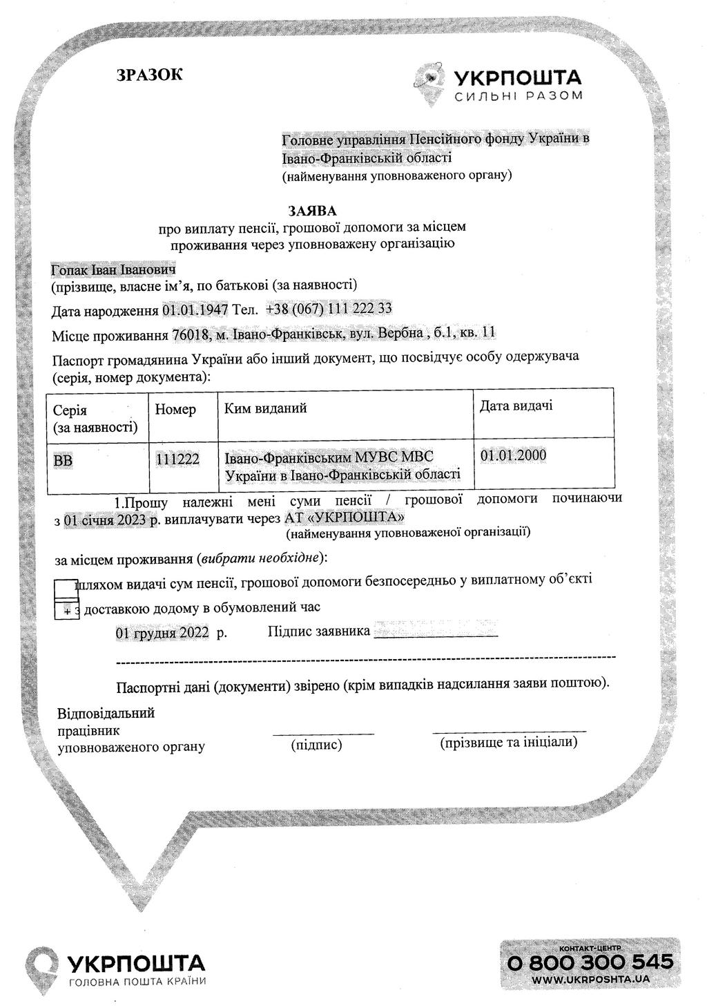 Додаток 2. Зразок заповнення заяви про виплату пенсії, грошової допомоги за місцем проживання через уповноважену організацію.